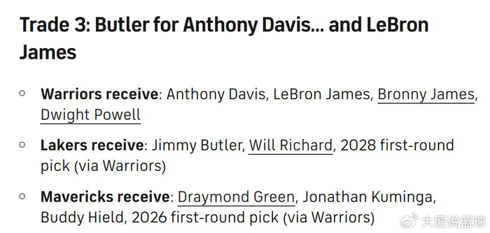 勇士得到:浓眉+詹姆斯+布朗尼+鲍威尔;