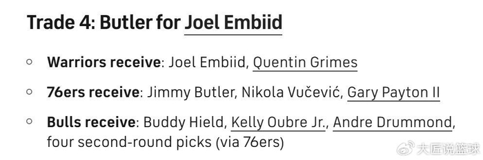 公牛得到:希尔德+乌布雷+德拉蒙德+4个二轮签。
